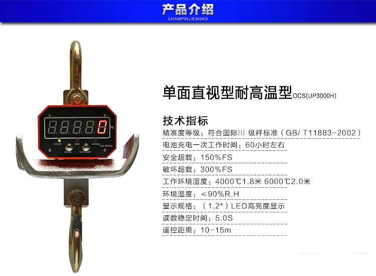 说明:此款吊秤为耐高温,隔热直视吊秤,冶金行业专业!秤体距离钢包液,1400度:1.8米以上,1600度:2米以上